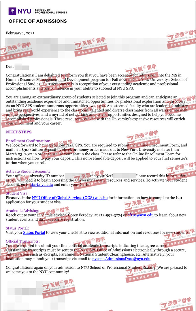 录取结果:NYU,MS in Human Resource Management and Development纽约大学人力资源管理与开发硕士