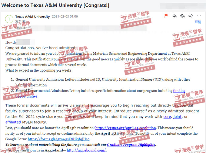 录取结果:TAMU,M.Eng in Materials Science and Engineering德州农工大学材料科学与工程硕士录取