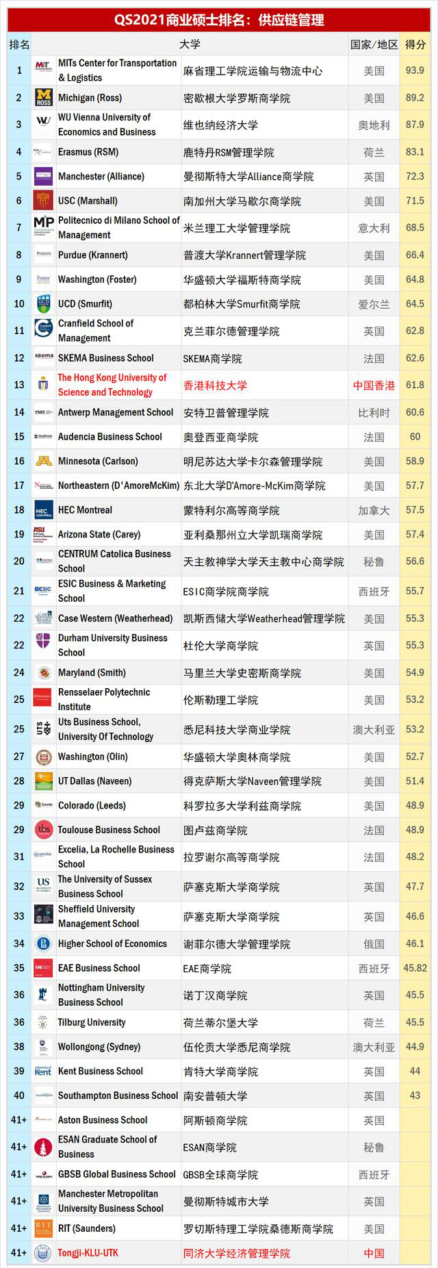 在这个首次发布的排名中,美国院校表现尤其突出,前十名中占据5所,其中其中麻省理工学院MIT的全球供应链管理硕士专业位列世界第一,密歇根州立大学罗斯商学院位列第二!