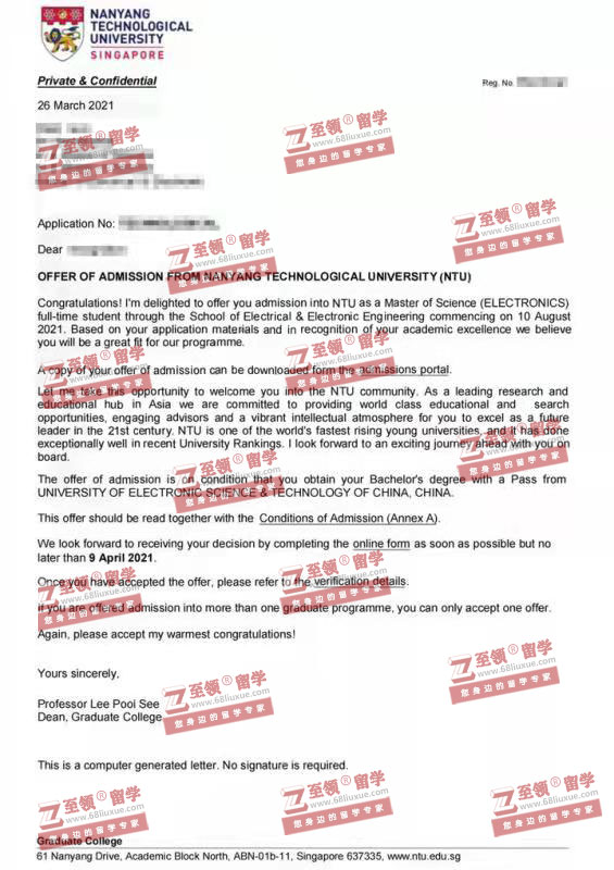 录取结果:Nanyang Technological University,Master of Science (ELECTRONICS)南洋理工大学电子学硕士录取