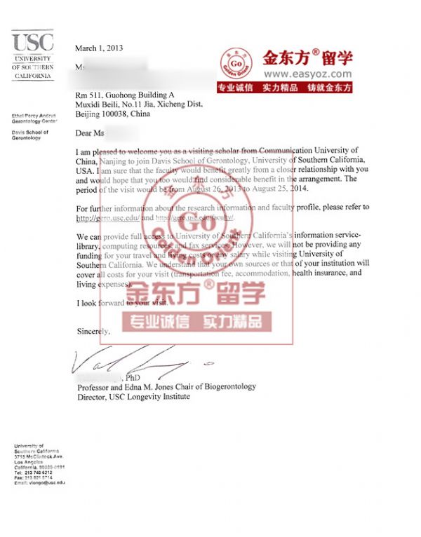 在申请的过程中,我们着重体现了HH老师对于老龄化管理的兴趣,并且详细的阐述了希望将来可以从事这方面工作的决心。HH老师曾经在国内某老龄化管理研究所工作做一段时间,这段经历我们在文书中也进行了详细的阐述和渲染。当然还有现在的不足以及提升个人能力和经验的需要,希望能加入对方的研究项目做交流访问。很快,南加州一位知名教授表示非常感兴趣接受其做交流访问学者。通过各方的努力,HH老师终于顺利获得南加州老龄化管理访问学者的邀请函,耗时大概一个半月。