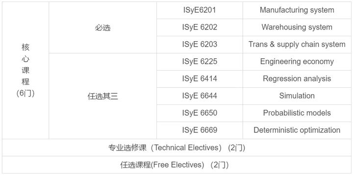 在专业选修课方面,项目要求学生,根据选课列表,在ISyE和其他院系(例如计算机系,数学系等)中,选择与制造和物流方向相关的课程,不在列表中的课程,需要经过advisor同意才可选择。除此以外,任选课程不受限制。具体培养方案如下表所示。