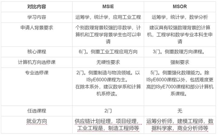 虽然都是运筹学相关项目,如下表3所示,佐治亚理工的工业工程和运筹学项目有以下几个不同之处。MSOR项目更侧重数理计算能力培养;MSIE项目更侧重应用,学生自由选择课程的空间更大,选课领域,在经过advisor批准的情况下,可以涉及佐治亚理工的各个院系和专业。在项目发展前景方面,两个项目都有进一步深造的机会,数理课程更多的MSOR更适合作为博士入学跳板项目。