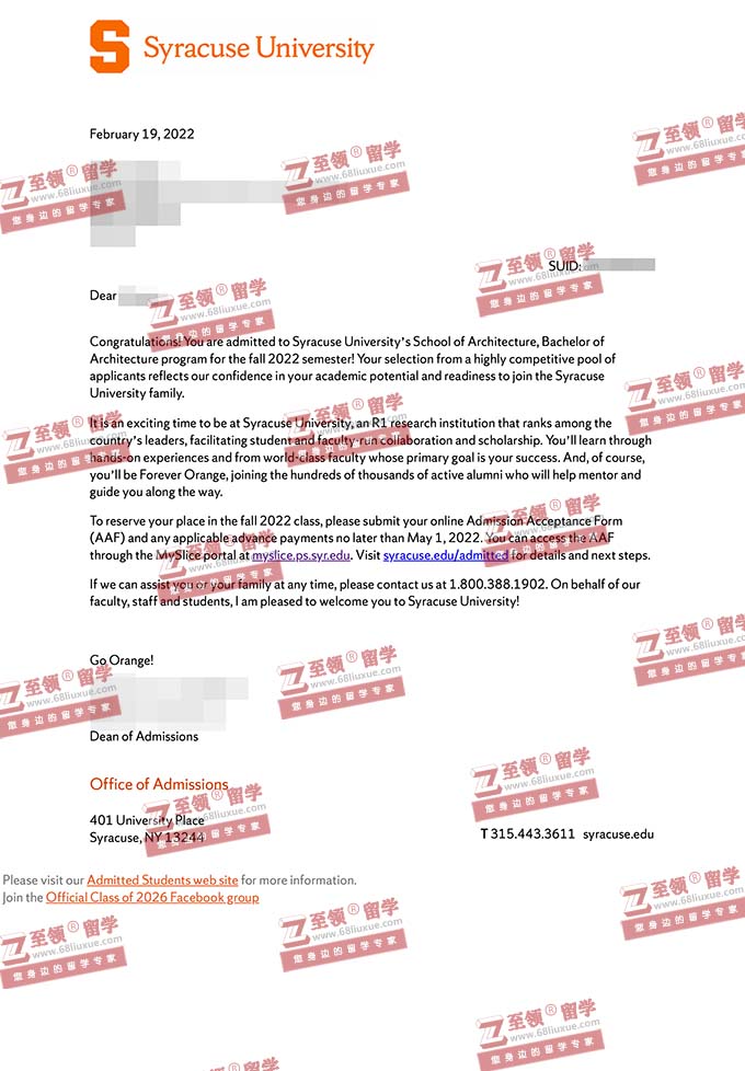 录取结果:Syracuse University,Bachelor of Architecture 雪城大学建筑学本科录取