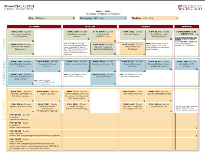 Mathematics项目成立于1996年,开设在数学系下,项目时长15months/5quarters。该项目致力于探索理论和应用数学与不断发展的金融之间的关系,赋予学生坚实的数学基础以使他们能够将数学应用于复杂的金融模型中。学生将通过参与衍生品定价和资产管理,学习如何使用复杂的数学和金融模型。芝加哥大学是著名的研究型大学,号称世界经济学和金融学的研究圣地。开设在数学系下面,秉承了数学系的学科优势,对数学偏重较大,秋季课程主要包括数学基础和金融市场,冬季和春季课程包括了统计、回归分析等与风险管理相关的课程。