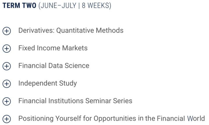 MFE 学生必须成功完成 28 个单元的课程作业(1 个单元 = 15 个课时),包括应用金融项目,以及实习或行业/独立学习项目。10 到 12 周的实习/行业项目或独立学习项目是毕业的必要条件。
