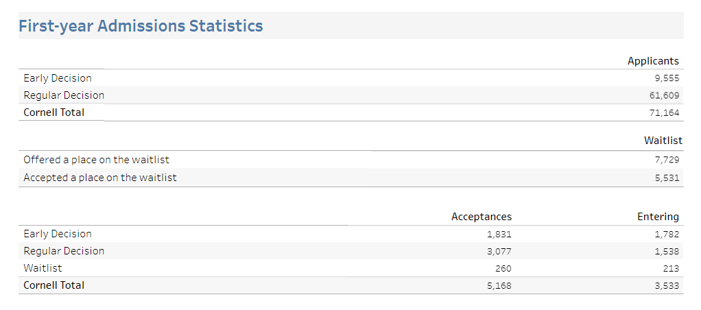 在2022Fall(2026届)申请季,共计有71164人申请康奈尔大学,其中ED早申请9555人,RD申请61609人。