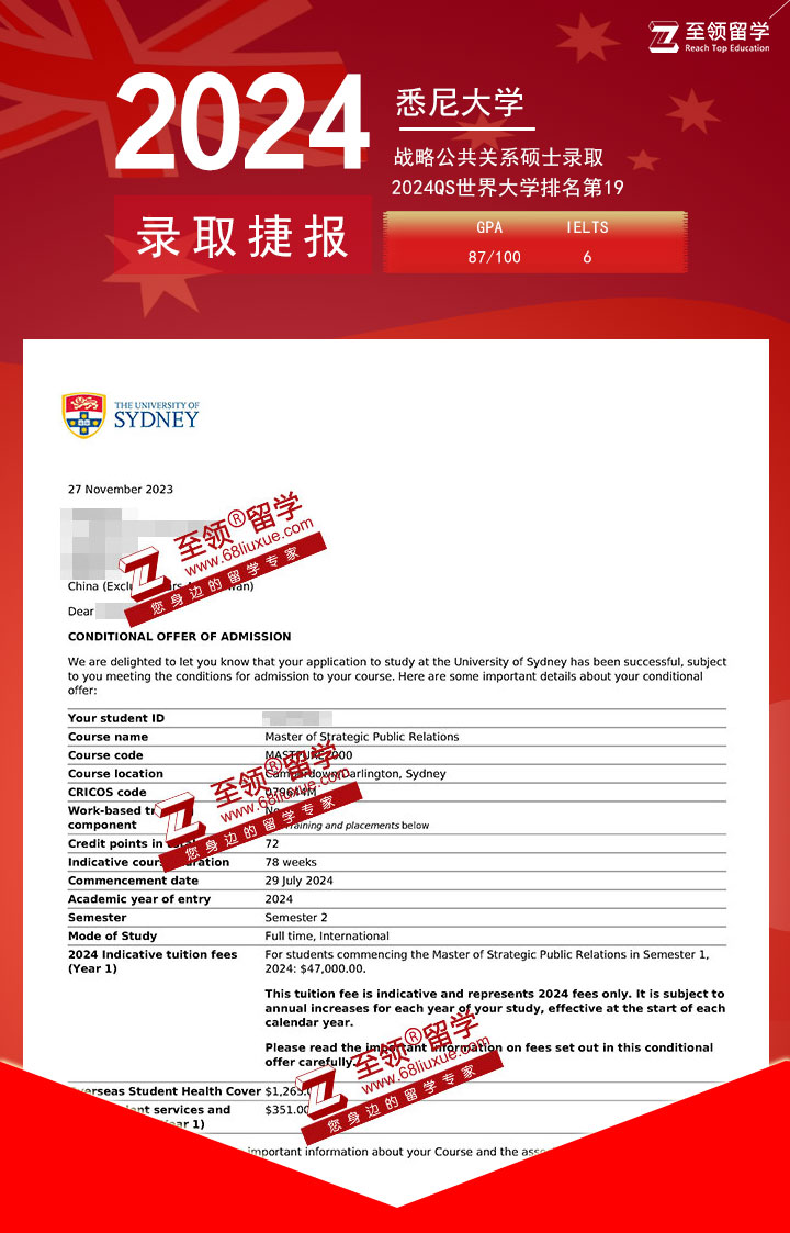 录取结果:The University of Sydney,Master of Strategic Public Relations 悉尼大学战略公共关系硕士