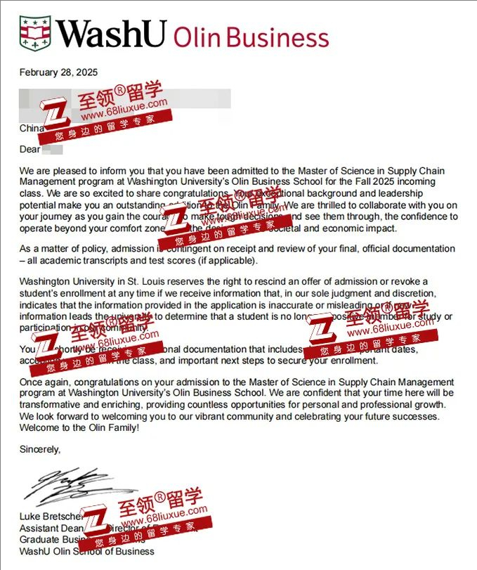 录取结果:圣路易斯华盛顿大学供应链管理硕士录取