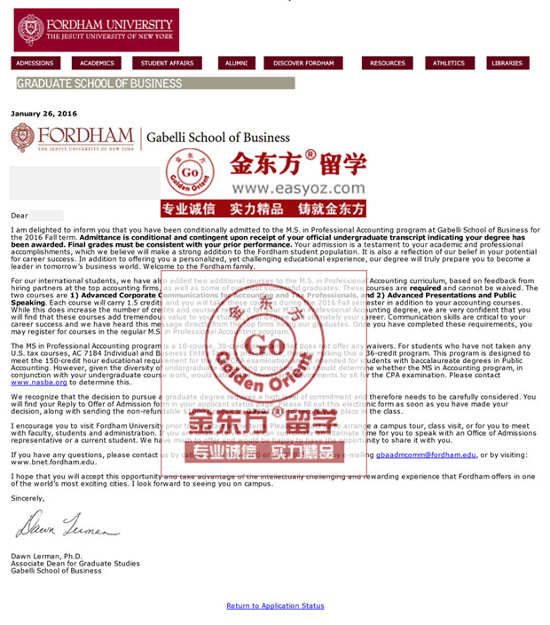 福特汉姆大学的会计申请和美国大多数院校的申请不太一样,采用的是纸申。在所有的材料准备完毕之后,S同学选择用DHL发给了福特汉姆大学。在这之后,专门写信给学校确认学校是否收到了S同学的申请材料。学生的专业是国际会计,很多课程都是使用的美国方面的教材,但是成绩单上并没有显示。为了补充说明,制作了一份详细的课程描述,用以说明S同学学了哪些课程,有哪些优势。再提交申请一个月之后,收到了福特汉姆大学会计的offer,S同学非常高兴。