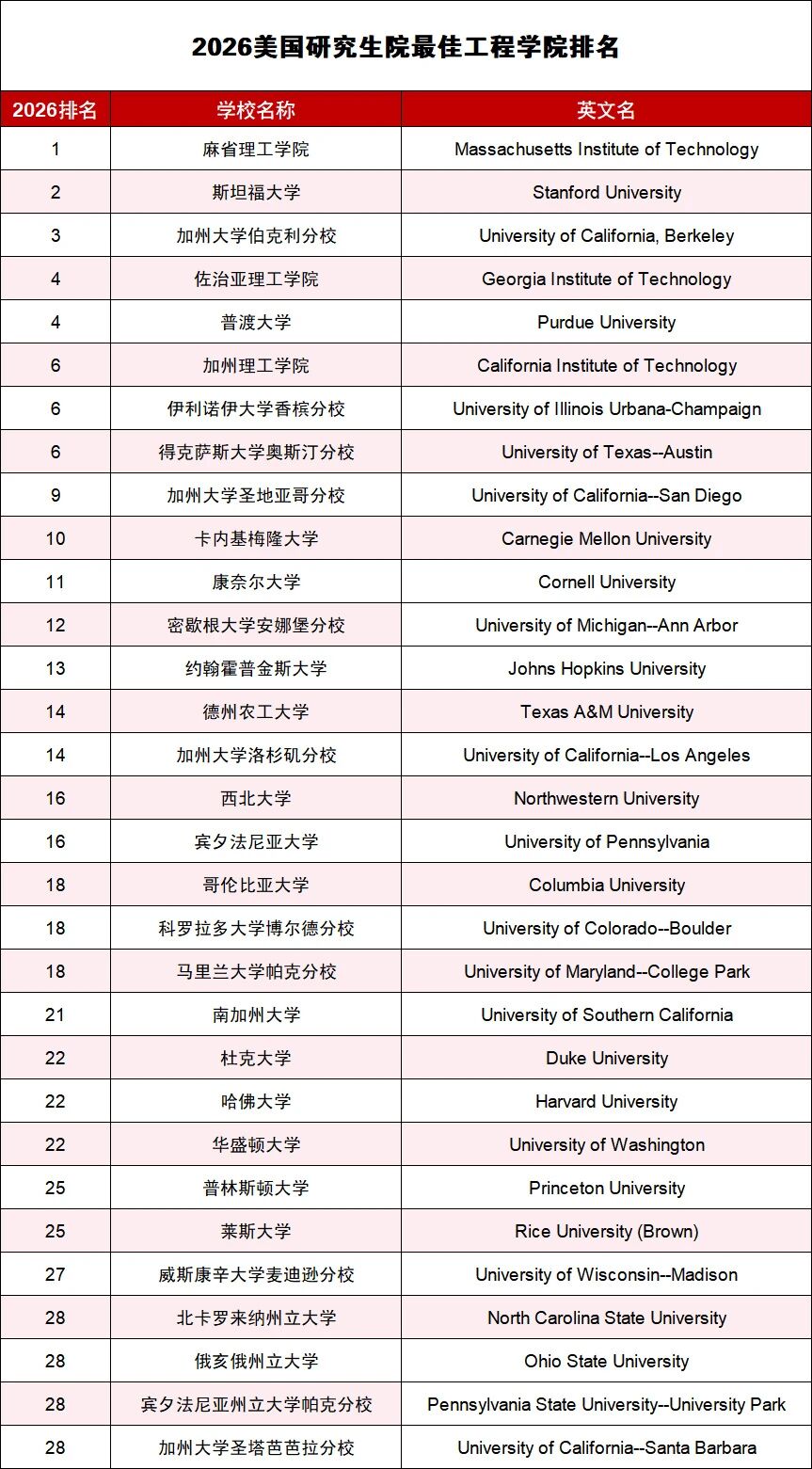 工程学院前五名阵容稳固,依然是MIT稳居榜首,其他学校也有不少变动,主要看点如下: