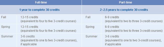 一般教学的课程都是3个学分,也有些是一个学分。同学们必须在两到三个学期内(一年包括秋季,春季,夏季三个学期)修完至少30个获得认可的学分。秋季和夏季至少要修满12-15个学分,也就是4-5门3学分的课程。附个表大家看得清楚些。