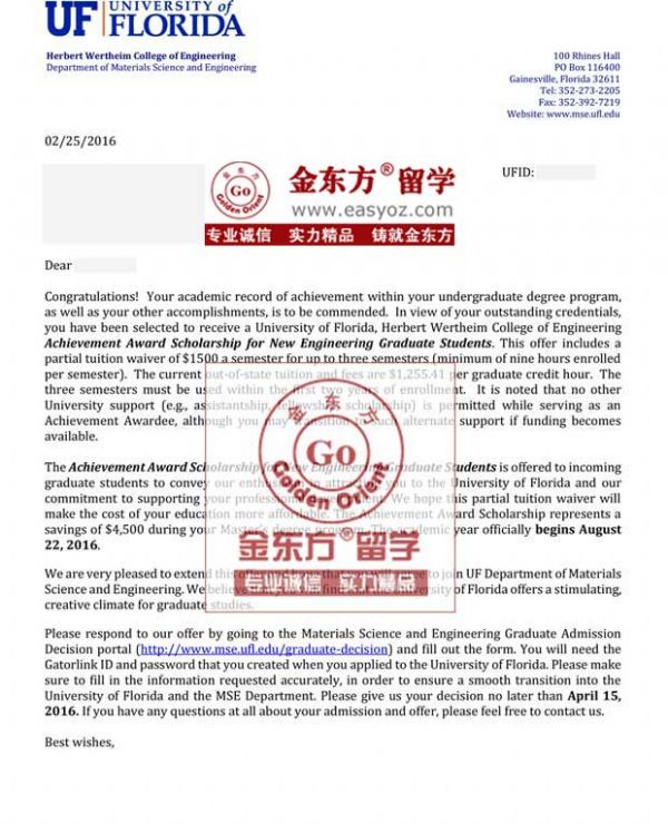 录取结果:U of Florida(佛罗里达大学), MS in Materials Science and Engineering材料科学与工程硕士,奖学金$4500