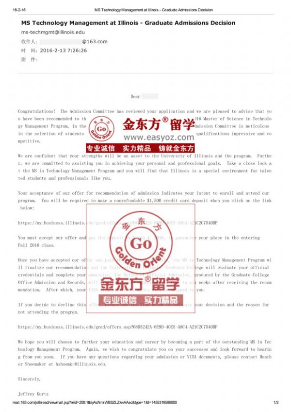 录取结果:伊利诺伊大学香槟分校(UIUC),MS in Technology Management技术管理硕士