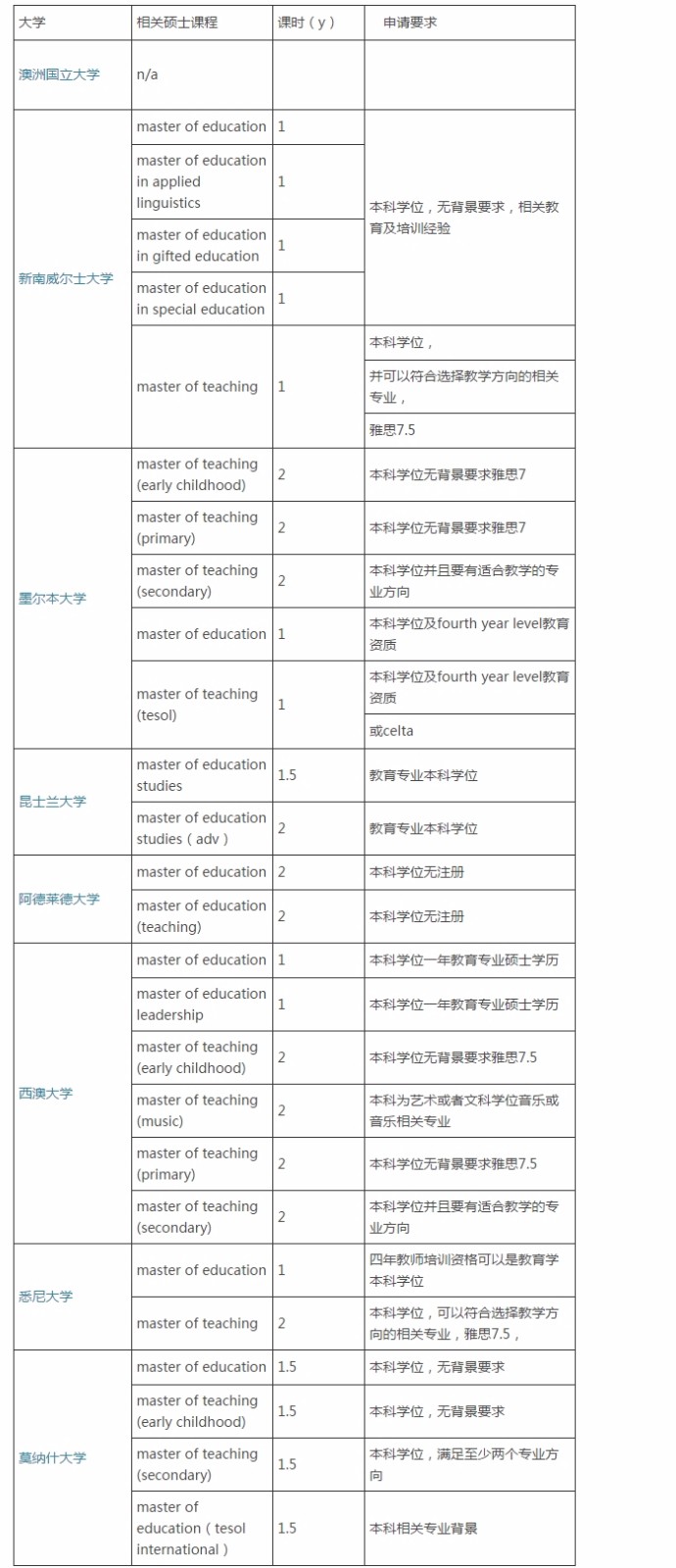 澳大利亚教育专业是主要偏重教学实践的一种职业性的培训。大体包括四种课程:教育学学士 (bachelor of education) (学制4年)、教育学硕士文凭 (graduate diploma of education)(1年)、教学硕士(master of teaching)(2年)、教育学硕士学位(master of education)(1年)。除了第四种课程之外,前3种课程都可以直接获得澳大利亚的教师资格。第四种偏重学术研究,适合本来已经从事教育工作或者有 教育学背景的学生进一步深造。