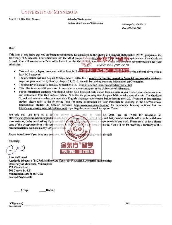 录取结果:University of Minnesota(明尼苏达大学), Master of Financial Mathematics (金融数学硕士)