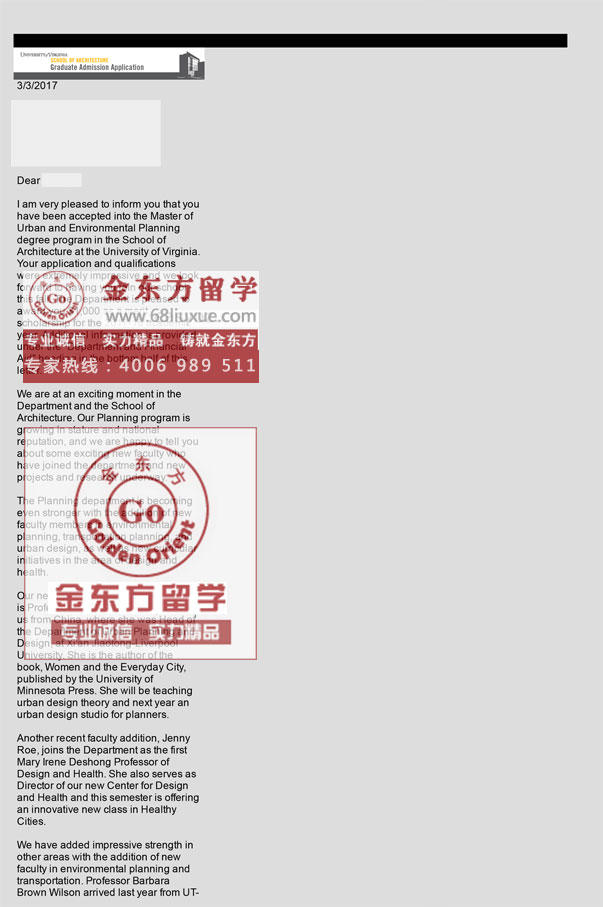 录取结果:University of Virginia (弗吉尼亚大学),Master of Urban and Environmental Planning 城市环境规划硕士,$1,000的奖学金