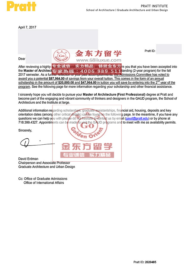 录取结果:普瑞特艺术学院,Master of Architecture建筑学硕士,奖学金$77964