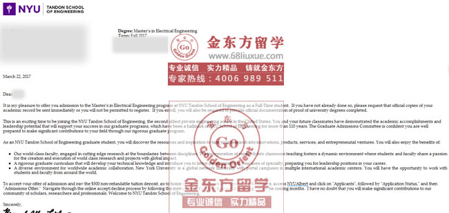 录取结果:New York University纽约大学,Master's in Electrical Engineering电子工程硕士