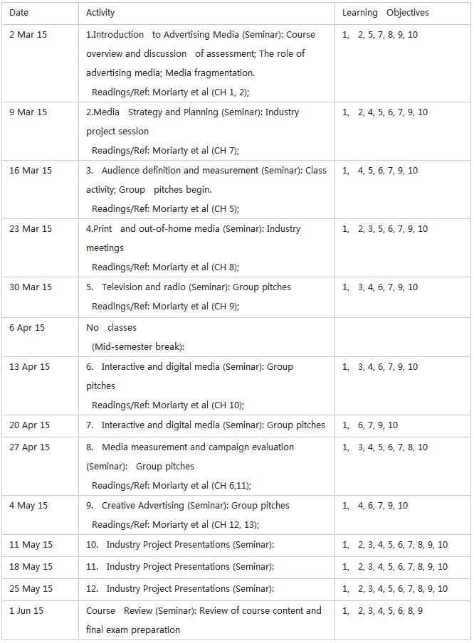这个课程主要是为了让学生有能力进行广告评估和制定广告计划,下面是15年的具体需要进行的学习活动。