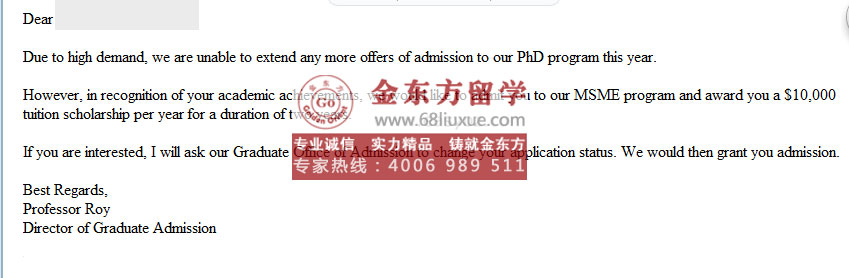 在备尝煎熬的一周等待之后,学校总算是有了回复。由于学校的科研资金有限,今年暂时不招博士生,D同学转录到机械工程硕士项目,每年给$10,000 的奖学金。