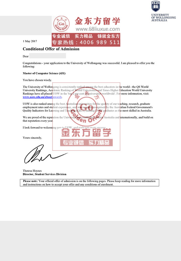 录取结果:University of Wollongong Australia (澳洲卧龙岗大学),Master of Computer Science (Multimedia and Visual Processing) Conditional(计算机科学硕士(多媒体和视觉处理)条件)