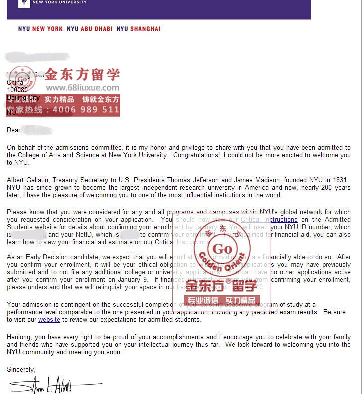录取结果:New York University纽约大学,ED录取