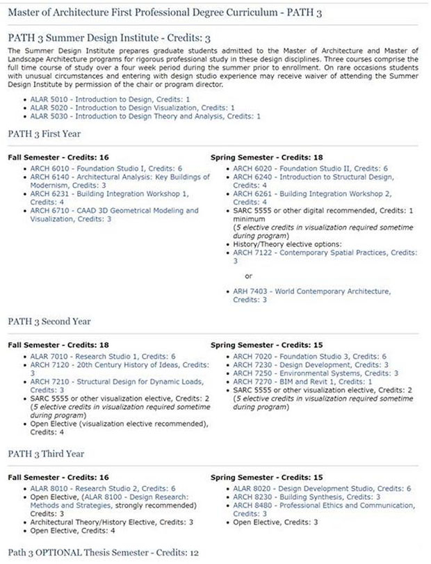 建筑学硕士 Master of Architecture 提供 Path1, Path2, Path2.5, Path3 这四种项目,每个项目后面的数字代表着项目的长度,其中除去 Path1 是非 NAAB 认证项目外,其他三个项目都为 NAAB 认证项目。