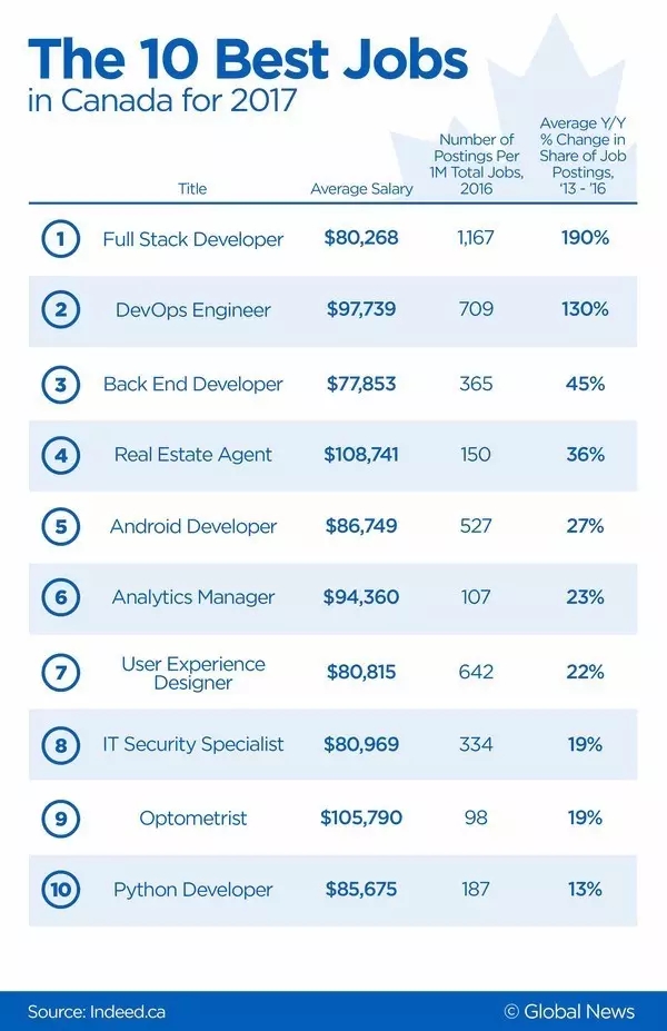 最近,求职网站Indeed.ca列出了2017年加拿大最好的十种工作。这些工作的平均薪水都超过了7万加币,而且2013年至2016年的新增工作总量也列出来了。