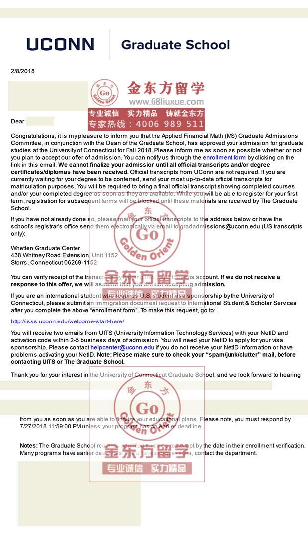 录取结果:Univ. of Connecticut康涅狄格大学,MSc Applied Financial Math金融数学硕士