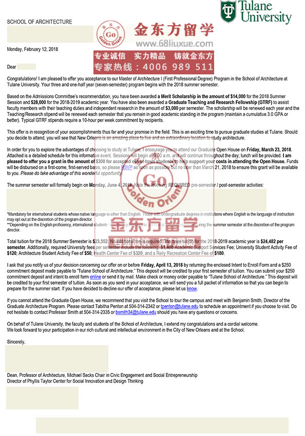 杜兰大学,Master of Architecture I(First Professional Degree) 录取,奖学金$34000/年;