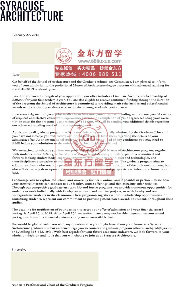 录取结果:Syracuse University 雪城大学,Master of Architecture 建筑学硕士,奖学金$20,000/年