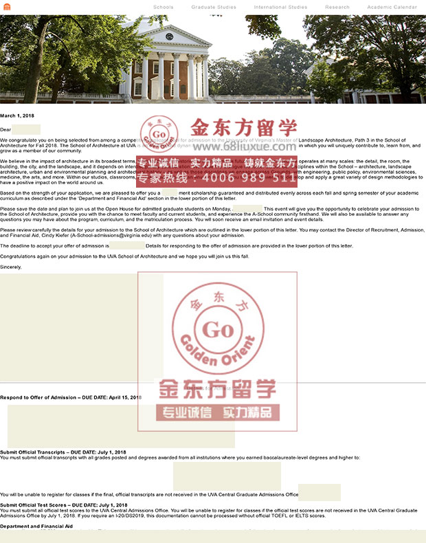 录取结果:University of Virginia (弗吉尼亚大学),Master of Landscape Architecture景观设计硕士,$7,500的奖学金