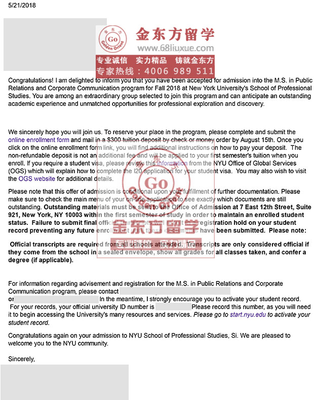 录取结果:New York University 纽约大学,MS in Public Relations and Corporate Communication 公共关系与企业传播硕士