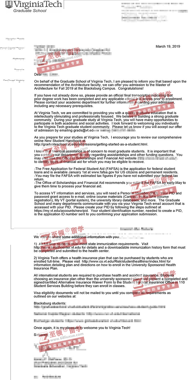 在至领留学团队的帮助下,Y同学和C同学很轻松地获得了弗吉尼亚理工大学建筑学硕士OFFER。