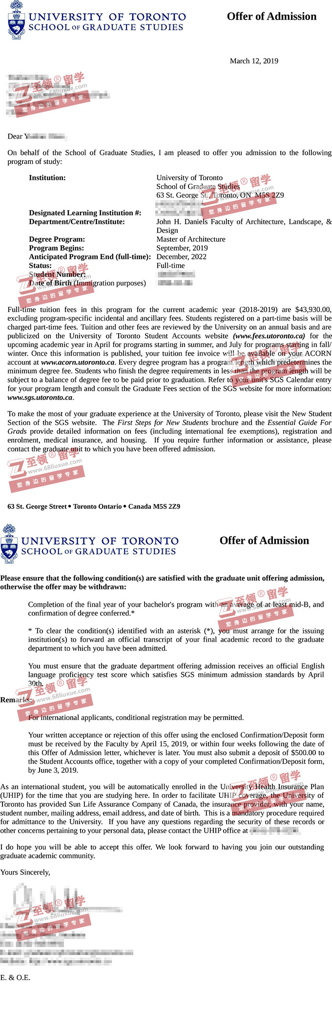 录取结果:University of Toronto,Master of Architecture 多伦多大学建筑学硕士录取