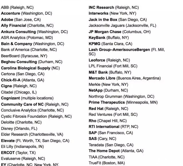 根据北卡州立大学发布的报告--“MASTER OF SCIENCE IN ANALYTICS EMPLOYMENT REPORT – CLASS OF