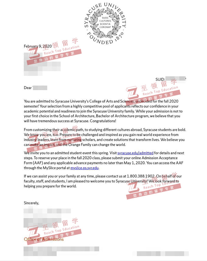 录取结果:Syracuse University,Bachelor of Architecture (5—year)雪城大学建筑学本科录取