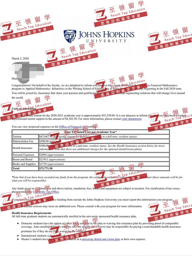 录取结果:Johns Hopkins University,M.S.E. in Financial Mathematics+奖学金$8,302约翰霍普金斯大学金融数学硕士带奖录取