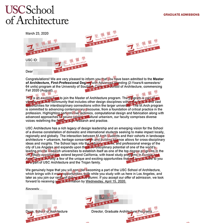 录取结果:USC,Master of Architecture, First-Professional Degree with Advanced Standing南加州大学建筑学硕士录取