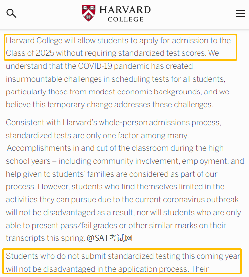 因为疫情的影响,很多高校不得不调整2021年秋季入学的录取政策。哈佛也公布了消息,将允许学生在不提交标准化考试成绩的情况下申请2025届的入学。