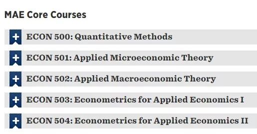 项目由15学分五门核心经济课和18学分选修课(选修几乎可以任选,data science, statistics, Finance(MBA), Marketing(MBA)相关均可,但博士课程一般不开放,除非少数大佬能要到老师permission)组成。经济核心课难度不难,和phd难度差很多。经济的授课老师有2-3门(共5门)课是professor,剩余是lecturer。”(校友反馈)