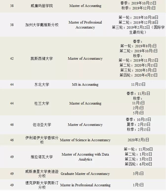 美国会计硕士一般设在商学院,综合排名TOP100的学校中,有70多个学校开设了会计项目。下面小编给大家整理了美国排名前50大学的会计硕士项目及申请截止日期: