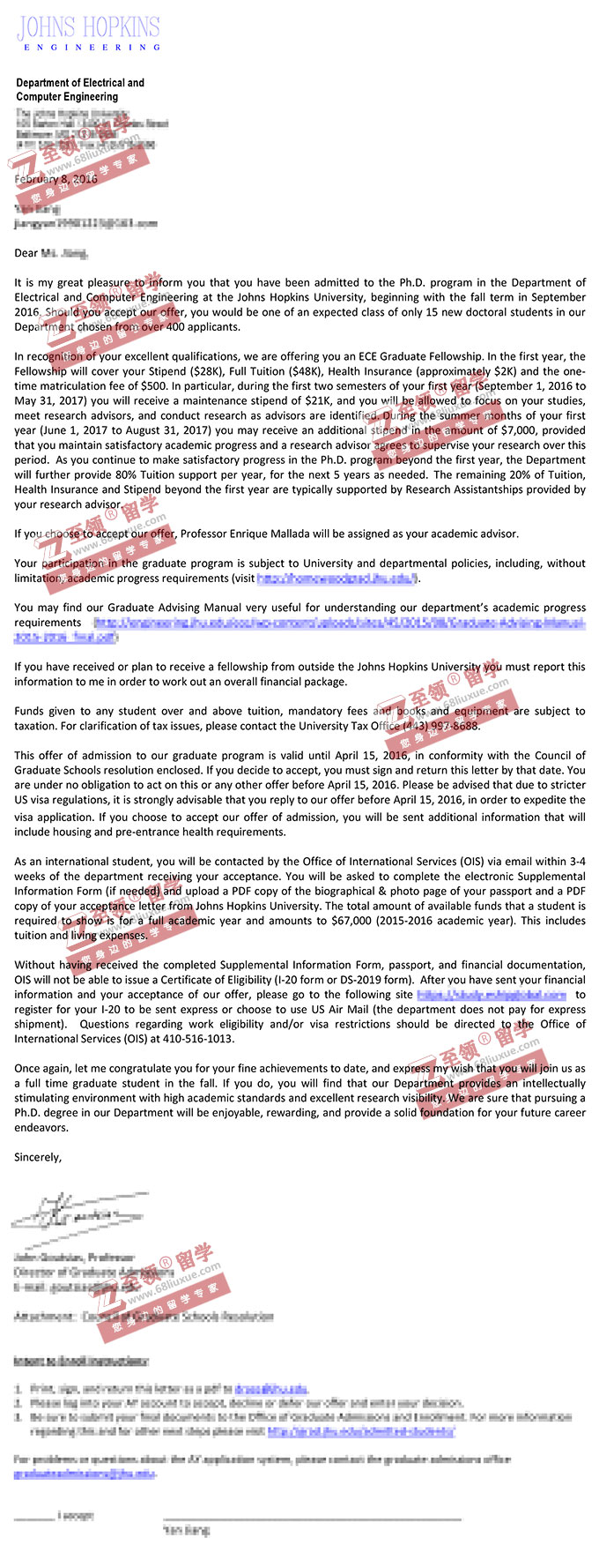 录取结果:约翰霍普金斯大学电子工程博士全奖$80,000/年